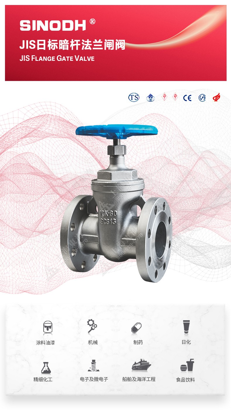 JIS日标暗杆法兰闸阀,为乐竞官方网站自主研发生产。本产品设计制造标准符合JISB2071标准,该产品是一种最常见的启闭阀,利用闸板的上下工作来接通(全开)和截断(全关)管道中的流体介质。