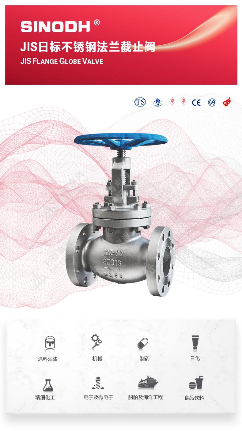 JIS日标不锈钢法兰截止阀,为乐竞官方网站自主研发生产。本产品设计制造标准符合J1SB2071标准,其启闭件是圆柱形的阀瓣,密封面呈平面或锥面,阀瓣沿流体的中心线作直线运动。国标截止阀只适用于全.开和全关,一般不用来调节流量,定做时允许作调节和节流。